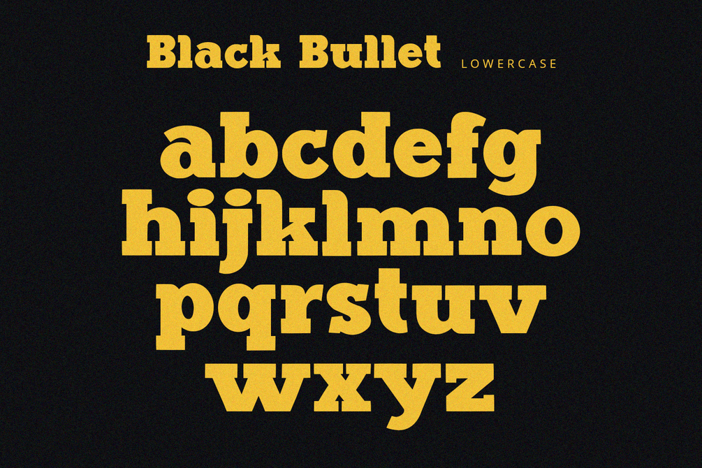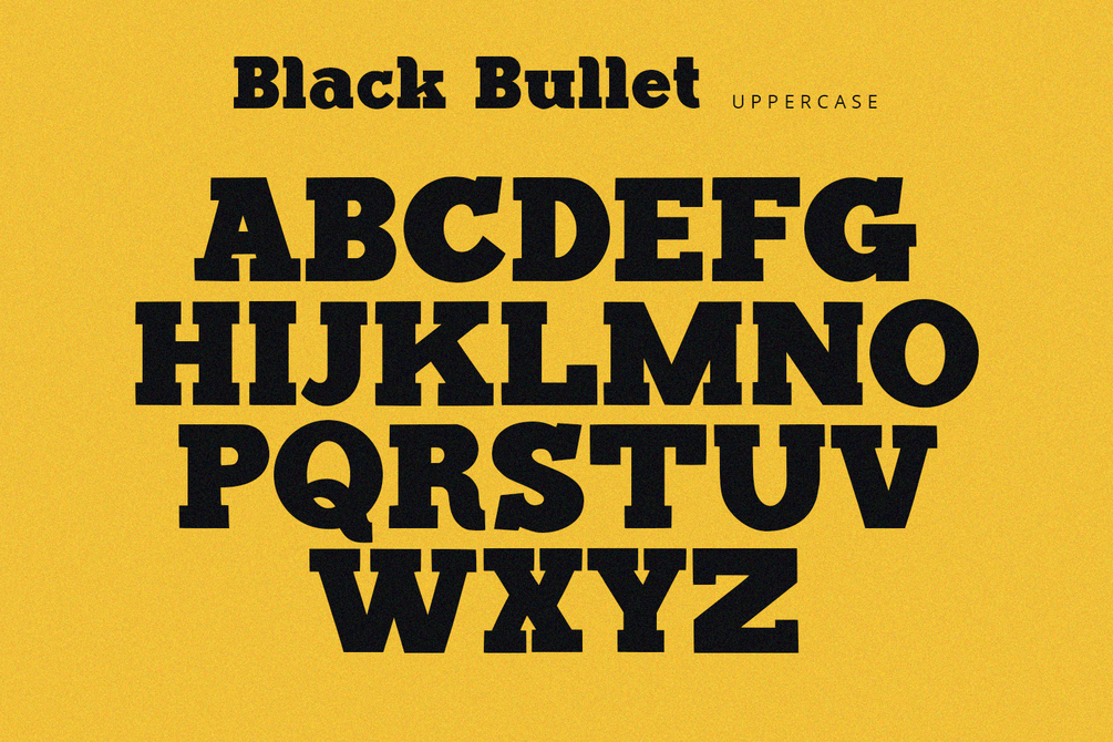 Black Bullet is serif font with bold and classic feels. It will be perfectly used for Branding, Logo Design, Lettering, Logotype, Clothing, Poster, magazine, packaging, posters, shopping bags, t-shirts, book covers, photography, special events and other design project.