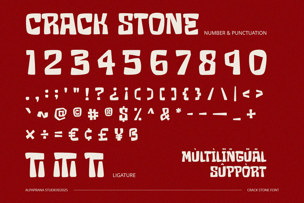 Crack Stone is bold display font with cute and playful feels. It will be perfectly used for Branding, Logo Design, Lettering, Logotype, Clothing, Poster, magazine, packaging, posters, shopping bags, t-shirts, book covers, photography, special events and other design project.