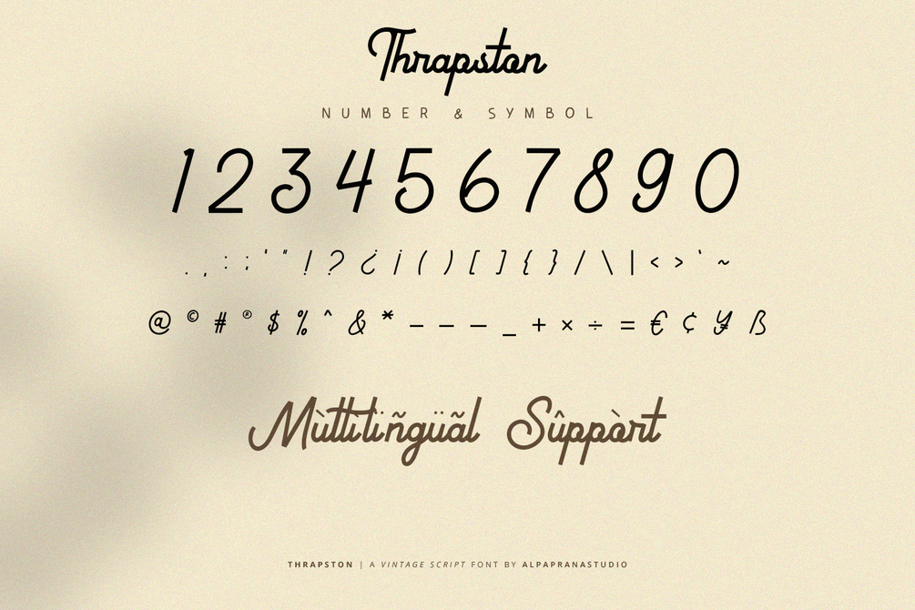 Thrapston is a vintage script font with vintage and retro feels. It will be perfectly used for Branding, Logo Design, Lettering, Logotype, Clothing, Poster, magazine, packaging, posters, shopping bags, t-shirts, book covers, photography, special events and other design project.