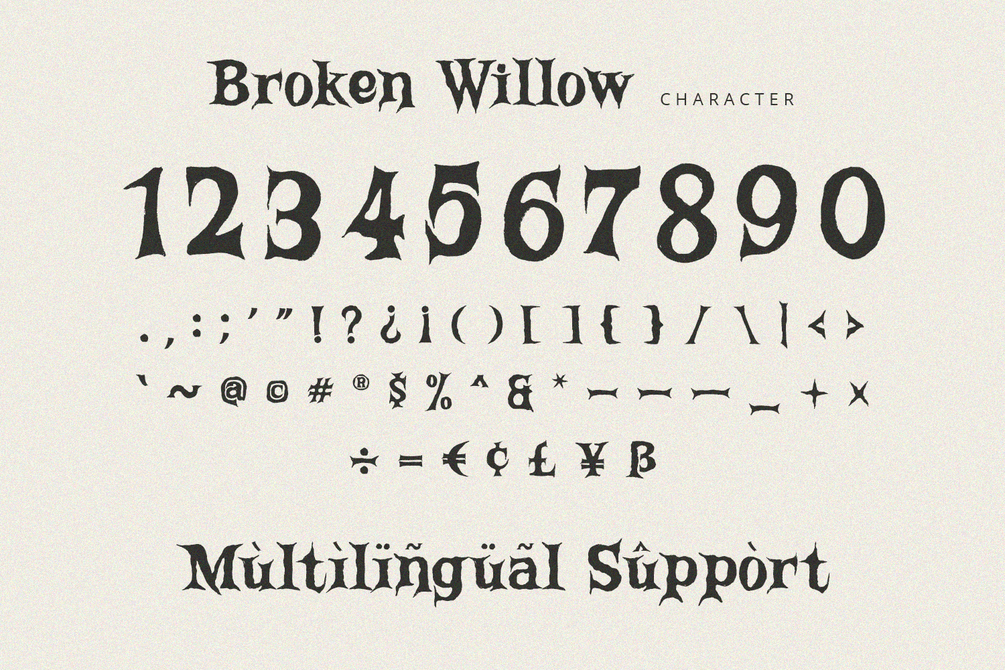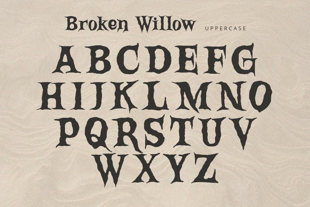 Broken Willow is display font with rough and scary feels. It will be perfectly used for Branding, Logo Design, Lettering, Logotype, Clothing, Poster, magazine, packaging, posters, shopping bags, t-shirts, book covers, photography, special events and other design project.