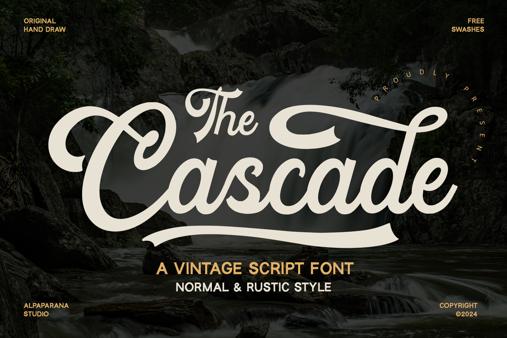 Cascade is a vintage script font with authentic and classic feels. It will be perfectly used for Branding, Logo Design, Lettering, Logotype, Clothing, Poster, magazine, packaging, posters, shopping bags, t-shirts, book covers, photography, special events and other design project.