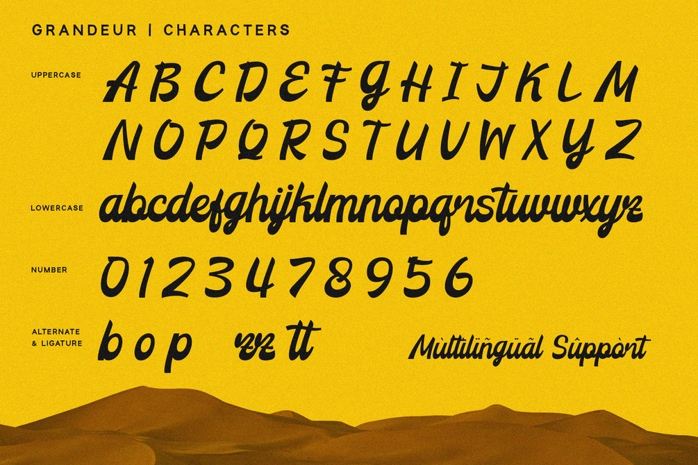 Grandeur is a bold script font with elegant and modern feels. It will be perfectly used for Branding, Logo Design, Lettering, Logotype, Clothing, Poster, magazine, packaging, posters, shopping bags, t-shirts, book covers, photography, special events and other design project.