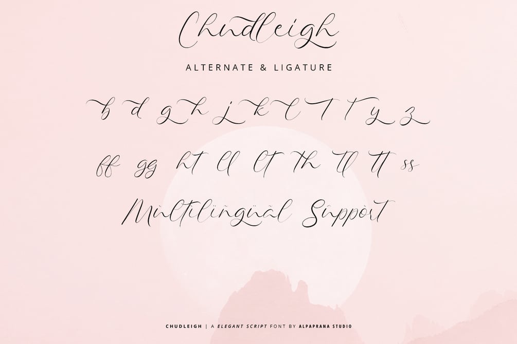 Chudleigh is a elegan script font with natural and modern feels. It will be perfectly used for Branding, Logo Design, Lettering, Logotype, Clothing, Poster, magazine, packaging, posters, shopping bags, t-shirts, book covers, photography, special events and other design project.