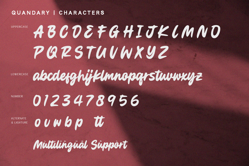 Quandary is a bold script font with elegant and modern feels. It will be perfectly used for Branding, Logo Design, Lettering, Logotype, Clothing, Poster, magazine, packaging, posters, shopping bags, t-shirts, book covers, photography, special events and other design project.