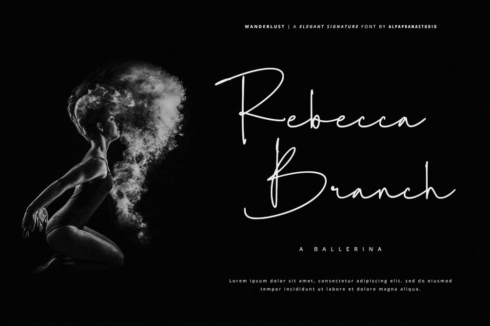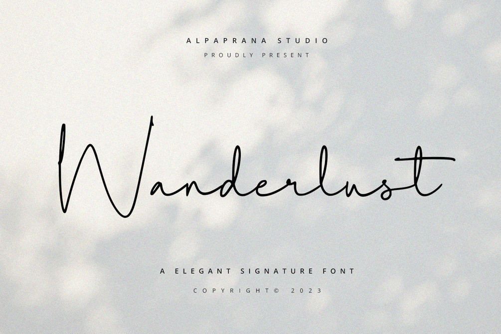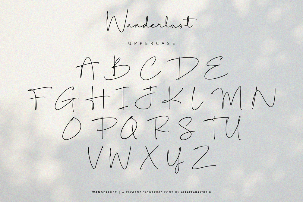 Wanderlust is a signature font with natural and modern feels. It will be perfectly used for Branding, Logo Design, Lettering, Logotype, Clothing, Poster, magazine, packaging, posters, shopping bags, t-shirts, book covers, photography, special events and other design project.