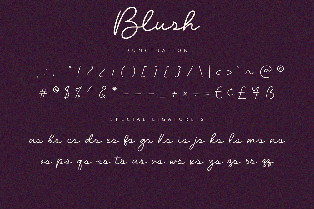 Blush is a script font with unique and modern feels. It will be perfectly used for Branding, Logo Design, Lettering, Logotype, Clothing, Poster, magazine, packaging, posters, shopping bags, t-shirts, book covers, photography, special events and other design project.